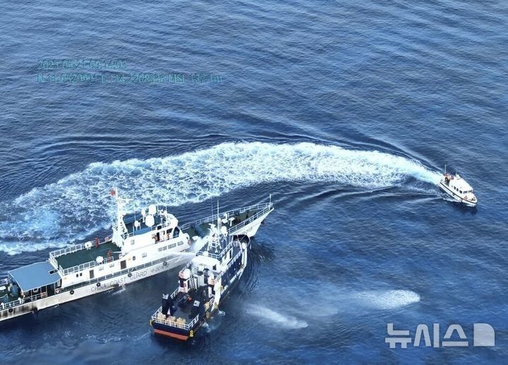 [샌디 케이(남중국해)=AP/뉴시스] ??국제상설중재재판소(PCA)가 중국의 남중국해 영유권 주장을 불법으로 판결한 지 9주년을 맞아, 중국과 필리핀이 다시한번 첨예한 입장차를 드러냈다.  사진은 남중국해 스프래틀리군도(중국명 난사군도, 필리핀명 칼라얀군도) 인근 ‘샌디 케이’ 암초 해역에서 지난 5월 21일 중국 해경선(왼쪽)이 필리핀 공무선과 대치 중인 모습. 2025.07.13