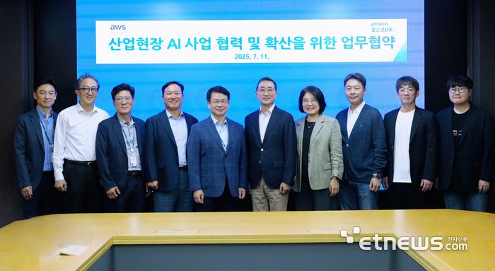 포스코그룹 내 AI 전환(AX)을 총괄하는 포스코DX는 지난 11일 판교 사옥에서 AWS와 '제조 AX 협력'을 발표했다. 심민석 포스코DX 사장과 함기호 AWS코리아 대표 등이 참석했다.
