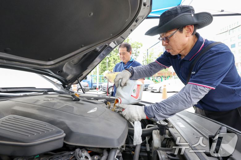 (서울=뉴스1) 민경석 기자 = 서울시 자동차전문정비사업조합(카포스) 송파구지회 정비사들이 13일 서울 송파구민회관 주차장에서 여름 휴가철을 맞아 차량 무상점검을 실시하고 있다. 2025.7.13/뉴스1