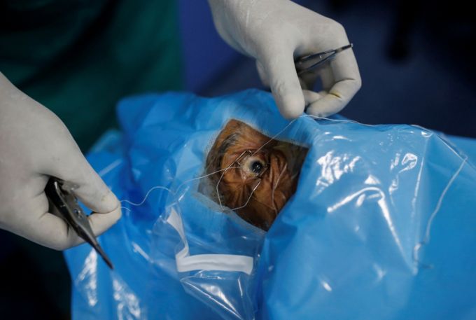 기차에 간이병원을 만들어 의료서비스를 제공하는 봉사단체 라이프라인 익스프레스가 백내장 환자에게 백내장 수술을 시행하는 모습. 사진은 2018년 3월 촬영됐다./로이터=뉴스1 |