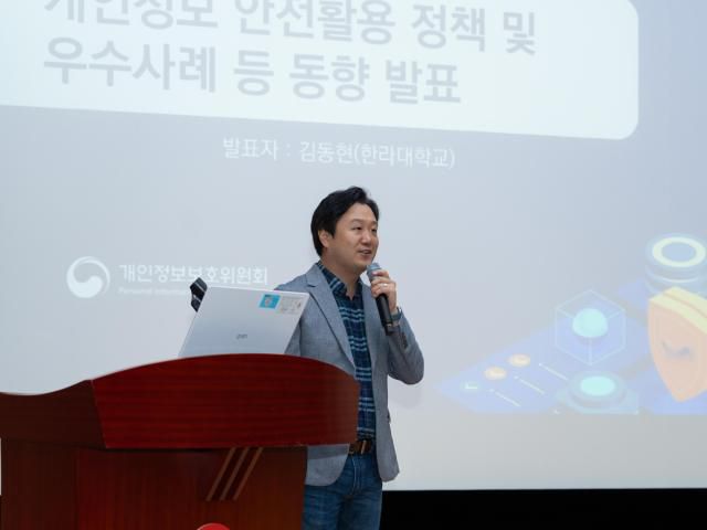 김동현 한라대 교수가 11일 강원특별자치 원주시 국민건강보험공단 본부에서 '개인정보 안전활용 정책 및 우수사례'등 동향을 발표하고 있다. [사진=개인정보위]