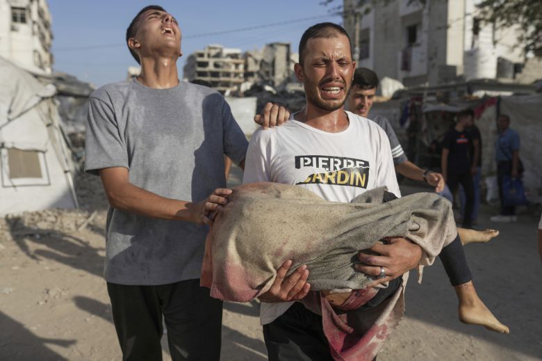 12일 한 팔레스타인인이 이스라엘군의 공습으로 숨진 어린이의 시신을 옮기고 있다. AP연합뉴스