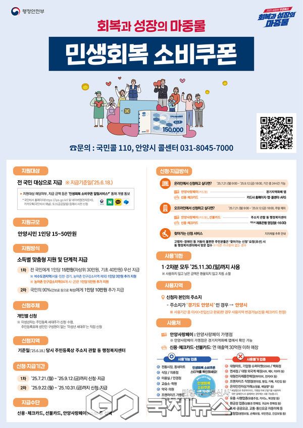 민생회복 소비쿠폰은 안양시민에게 1인당 15~40만원(일반 15만원, 차상위계층·한부모가족 30만원, 기초생활수급자 40만원)이 지급되며, 시민의 90%(건강보험료 등으로 확정)에게 추가로 10만원이 지급된다.