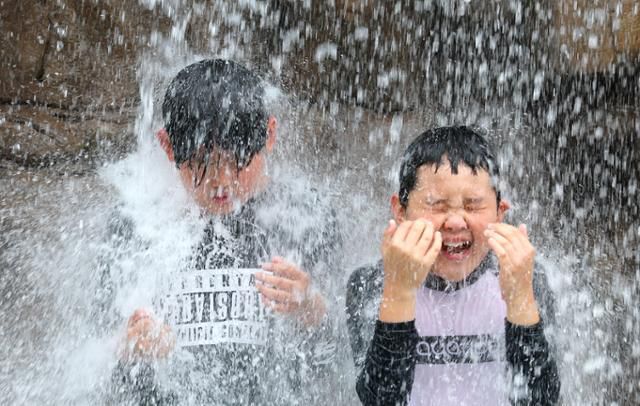폭염이 이어진 13일 인천 서구 경명공원 물놀이 시설을 찾은 어린이들이 폭포 물줄기를 맞으면서 더위를 식히고 있다. 기상청은 이날 저녁부터 15일 오후까지 전국적으로 비가 내릴 예정이라고 예보했다. 특히 남부지방을 중심으로 최고 150㎜에 달하는 호우가 예상된다. 연합뉴스 |