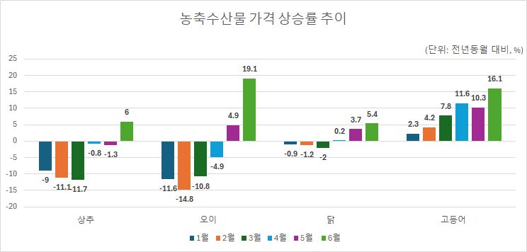 6월 농산물 중 오이의 가격은 전년 동월 대비 19.1% 오르고, 부추 상추의 가격은 각각 9.7%, 6% 올랐다.
