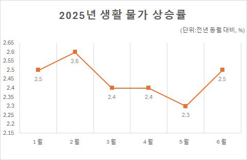 생활물가지수는 1월 2.5%에서 5월 2.3%로 낮아졌지만, 6월부터 폭염이 이어지며 2.5%까지 상승했다. 생활물가지수는 소비자들이 일상생활에서 자주 구매하거나 가격 변동에 민감한 품목들의 가격 변동을 나타내는 지수로, 소비자들이 체감하는 물가 수준을 알 수 있다.