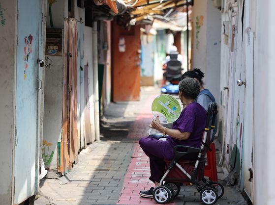 기록적인 폭염이 계속된 9일 서울 영등포 쪽방촌 골목에서 한 주민이 부채질을 하고 있다. 연합뉴스