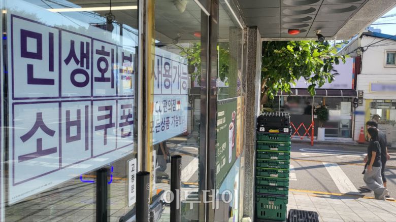 1인당 15만원에서 최대 55만원까지 받을 수 있는 민생회복 소비쿠폰 지급을 앞두고 10일 서울의 한 편의점에 소비쿠폰 사용처 안내 문구가 붙어있다. |