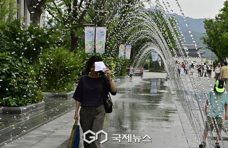 (서울=국제뉴스) 안희영 기자 = 초복을 일주일 앞둔 13일 서울 종로구 광화문광장 분수대를 찾은 어린이와 시민, 관광객들이 더위를 식히고 있다. 금일 광화문광장 분수대 일대를 찾은 어린이와 시민들은 폭염속에 비가 내리는 가운데에도 즐거운 표정을 지으며 휴일 나들이를 즐겼다.