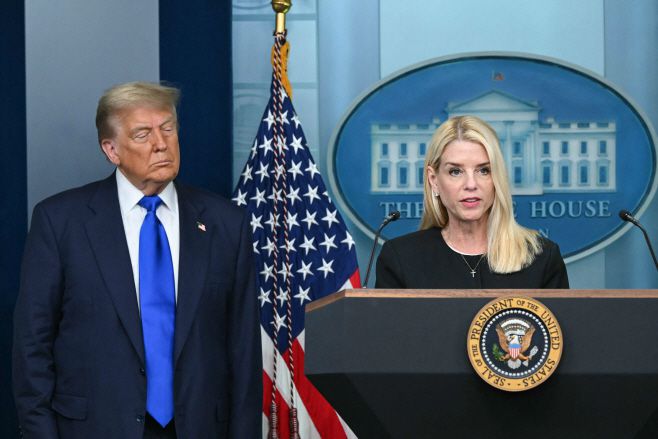 팸 본디 미국 법무부 장관(오른쪽)이 지난달 27일(현지시간) 미국 워싱턴 DC 백악관 브래디 브리핑룸에서 기자회견하고 있다. 그의 옆에 도널드 트럼프 미국 대통령이 서 있다./AFP 연합