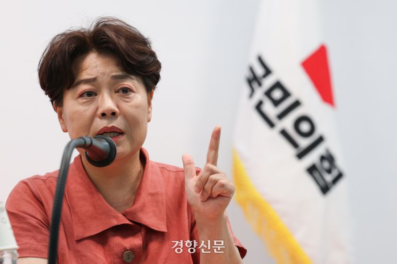 윤희숙 국민의힘 혁신위원장이 13일 서울 여의도 중앙당사에서 기자간담회를 하고 있다. 권도현 기자
