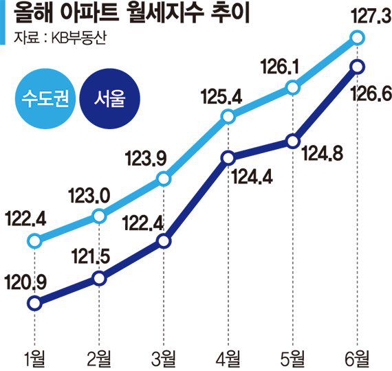 KB부동산에 따르면 지난 6월 서울 아파트 월세지수는 1.46% 상승했다. 월세지수는 126.6를 기록하며 사상 최고치 행진을 이어가고 있는 상황이다. 수도권 월세 지수도 6월 127.3으로 통계 조사 이후 역대 최고 수치이다. 월세 거래 비중도 늘고 있다. 서울시에 따르면 올 1~6월 전체 전월세 거래에서 월세 비중은 42.7%를 기록했다. 올해 들어 3월(38.4%)을 제외하고는 40%대를 넘고 있다.