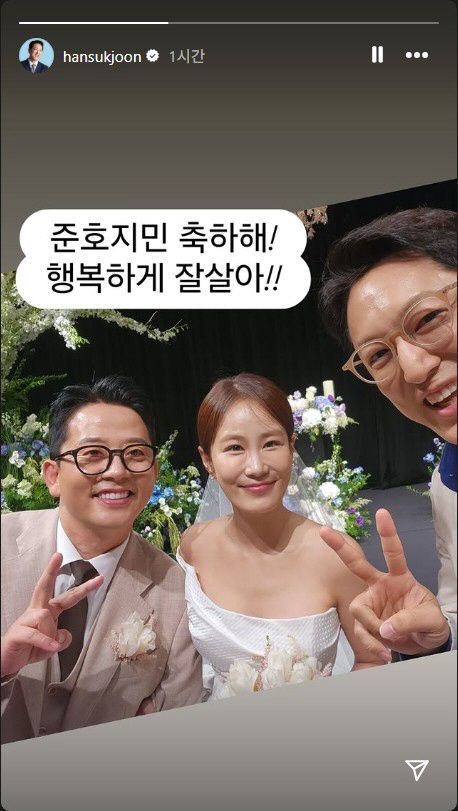 13일 오후 방송인 한석준은 자신의 SNS에 "준호지민 축하해. 행복하게 잘살아"라는 문구와 함께 한 장의 사진을 게재했다. 공개된 사진에는 김준호·김지민 부부와 함께 환한 미소를 짓고 있는 한석준의 모습이 담겨 있다. 단정한 턱시도를 입은 김준호와 순백의 드레스를 입은 김지민은 나란히 브이 포즈를 취하며 행복한 신혼의 시작을 알렸다.