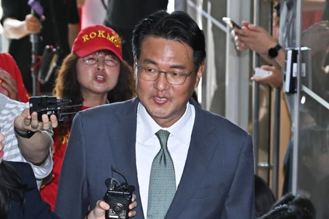 김태효 전 국가안보실 1차장이 11일 채 상병 사건과 관련해 피의자 조사를 받기 위해 서울 서초구 채 상병 특별검사팀 사무실 출석하고 있다. 정다빈 기자 |