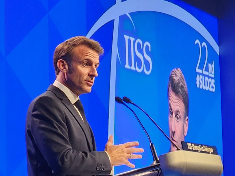 에마뉘엘 마크롱 프랑스 대통령이 지난 5월 싱가포르 샹그릴라호텔에서 열린 아시아안보회의에서 연설하는 모습. [연합뉴스] |