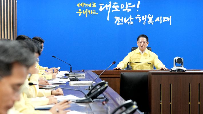 김영록 전라남도지사가 13일 오후 도청 재난종합상황실에서 실국장 등이 참석한 가운데 '집중호우 대비 대처상황보고회'를 주재하고 있다. 전라남도 제공