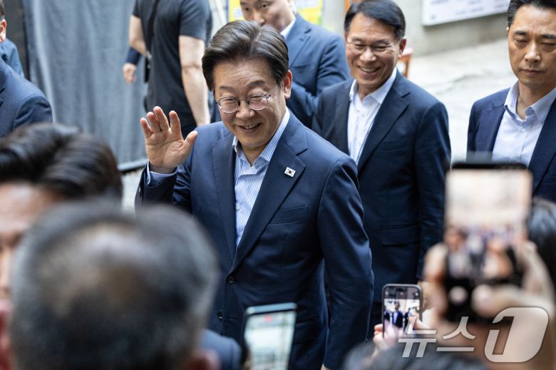 이재명 대통령이 11일 시민들과 저녁 식사를 위해 서울 종로구 광화문 인근의 한 식당으로 이동하고 있다. 2025.7.11/뉴스1 ⓒ News1 이승배 기자