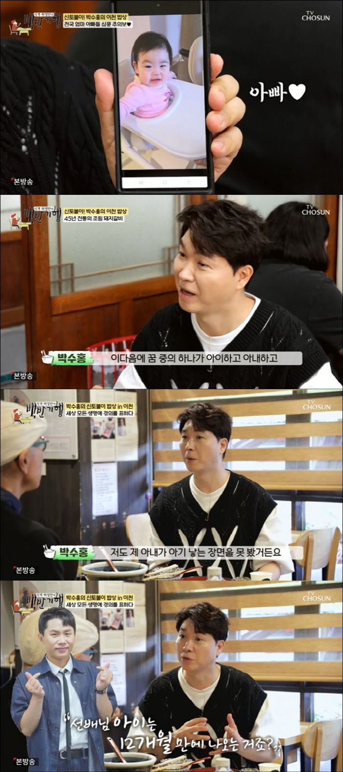미식가인 박수홍은 "나중에 아이하고 아내하고 맛집투어 하는 것도 계획하고 있다"고 꿈을 드러냈다. 이에 허영만은 뒤에 있는 아기를 가리키며 "재이가 저만하냐"고 딸에 대해 물었고 박수홍은 "조금 더 크다. 개월 수가 1개월 빠르다"고 밝혔다. 그러면서 박수홍은 아이 엄마에게 "(아기가) 아빠라고 아직 안 하지 않냐"며 "(재이는) 아빠, 엄마를 하는데 진짜 미치는 줄 알았다 너무 예뻐서"라고 딸바보 면모를 드러냈다.