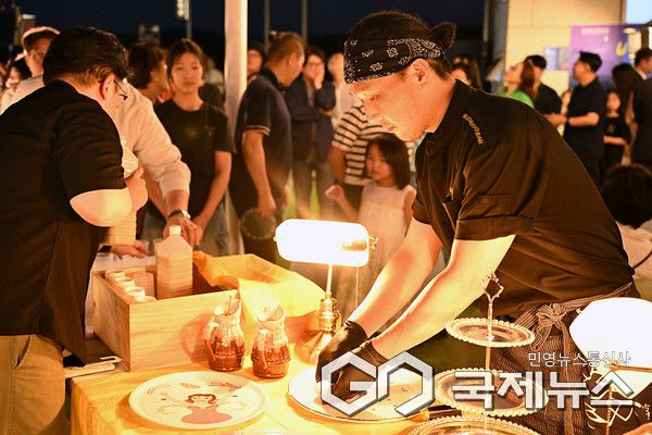 (안성=국제뉴스) 엄태수 기자 = 경기 안성시 박두진문학관에서 11일 오후 야간경제 활성화 사업 '오늘 안성 밤마실 어떠세요?'의 일환으로 개최된 「박두진문학관, 음악과 문학이 만나는 밤 '별밭에 누워'」 행사에서 남기윤 셰프가 시집 『박두진 12곡』에서 영감을 받아 창작한 핑거푸드를 선보이며 관람객들의 큰 관심을 끌었다. 각각의 메뉴는 박두진 시인의 대표 작품의 이미지와 감성을 요리로 재해석해 문학과 미식이 어우러진 새로운 문화 체험을 선사했다. 참가자들은 "시는 눈으로만 읽는 줄 알았는데, 이렇게 맛으로도 느낄 수 있다니 신선하다"며 감탄을 전했다.