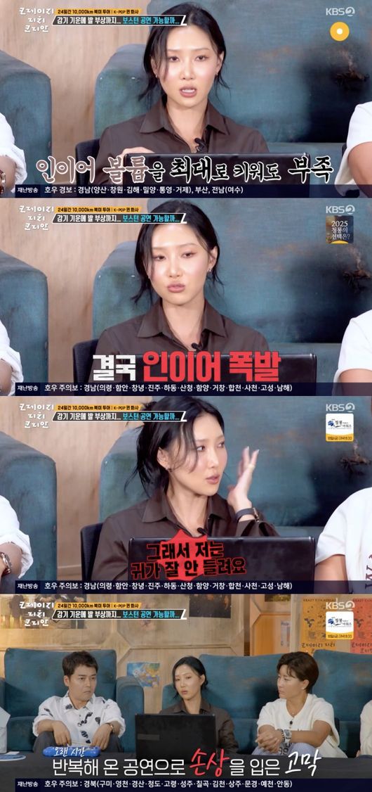또 화사는 “함성 소리가 너무 크니까 인이어 볼륨을 최대로 키웠다. 근데도 안 들리더라. 최대로 키우면 이명 생겨서 고막이 다친다. 제가 너무 안 들려서 최대로 올렸는데 인이어가 터졌다”라고 밝혀 모두를 놀라게 했다.