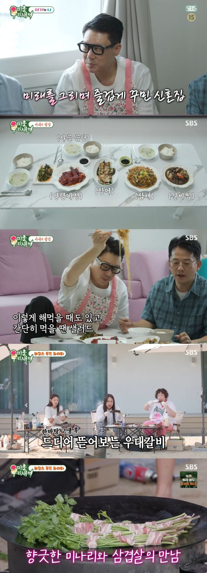 물놀이를 마친 세 사람은 솥뚜껑 바비큐 파티를 즐겼다. 또 한혜진은 “여러분이 한 번도 보지 못한 비주얼을 제가 보여드릴게요”라며 미나리 삼겹살 위에 달걀, 라이스페이퍼를 올려 전을 만들었다. 전을 맛본 풍자는 “요즘에 나 다이어트 하고 있거든. 최근에 17kg 빠졌어”라며 건강한 전을 맛있게 먹었다.