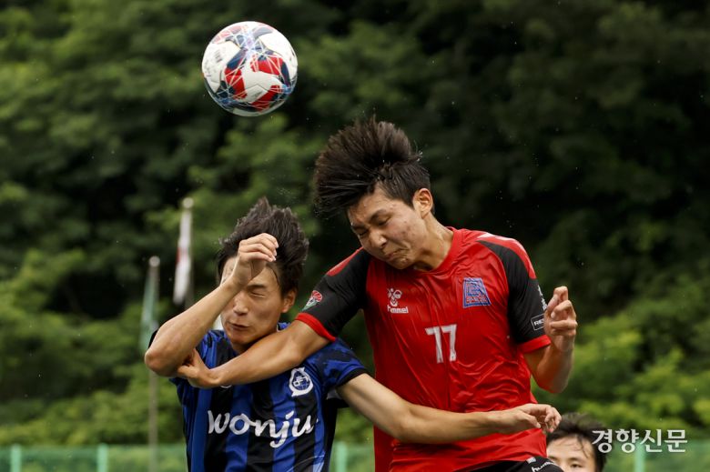 강원 미래고 곽연우가 13일 제천축구센터에서 열린 58회 대통령금배 전국고교축구대회 경기 구리고와의 경기에서 볼경합을 하고 있다. 제천ㅣ문재원 기자 |