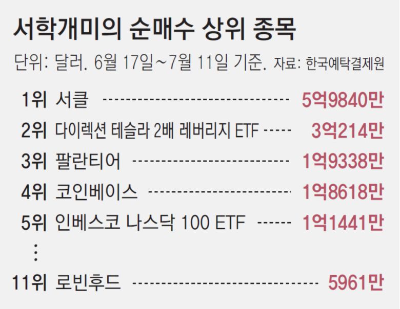같은 기간 서학개미들의 순매수 4위(1억8618만 달러)는 코인베이스, 11위(5961만 달러)는 로빈후드였다. 코인베이스는 미국 1위의 가상자산 거래 업체이고, 로빈후드는 매매수수료 없이 주식이나 가상자산을 거래할 수 있어 미국 젊은층 사이에 인기가 많다.