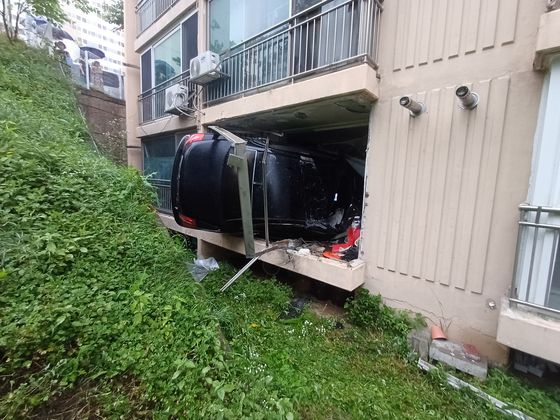 13일 오후 6시 42분쯤 50대 A씨가 몰던 승용차가 외벽을 뚫고 1층 베란다로 돌진했다.