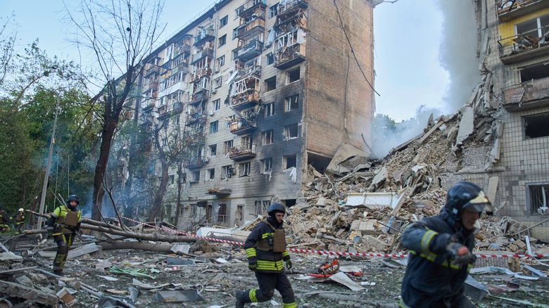 ▲ 지난달 17일 우크라이나 키이우에서 러시아 미사일과 드론의 공습을 피하기 위해 구조대원들이 대피소로 달려가고 있다.