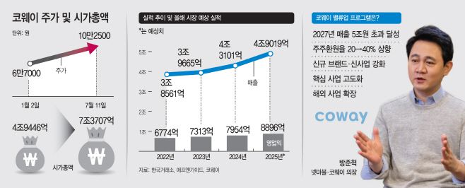 실제로 코웨이는 올 2월 '코웨이 밸류업 프로젝트'를 발표하며 핵심사업 고도화, 신규 브랜드·신사업 강화, 해외 사업 확장을 통해 2027년 매출 5조원 초과 달성과 총주주환원율을 기존 20%에서 40%로 상향하는 것을 목표로 제시했다.