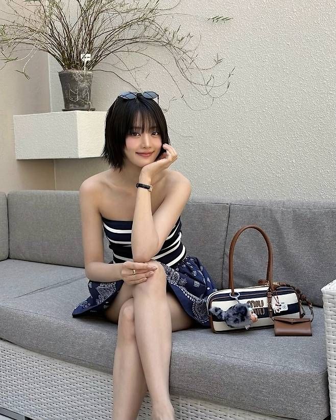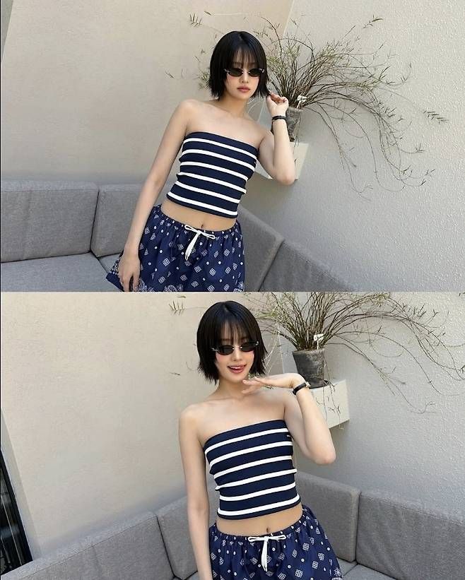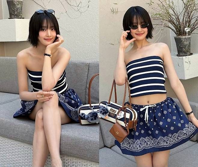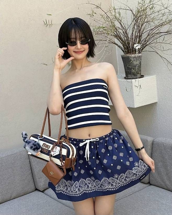 사진 속 민니는 네이비와 화이트 스트라이프 튜브톱에 페이즐리 패턴이 더해진 미니 스커트를 매치해 눈길을 끌었다. 시원한 소재감이 느껴지는 이 룩은 한낮의 태양 아래서도 차분하게, 또 당당하게 빛을 발했다.