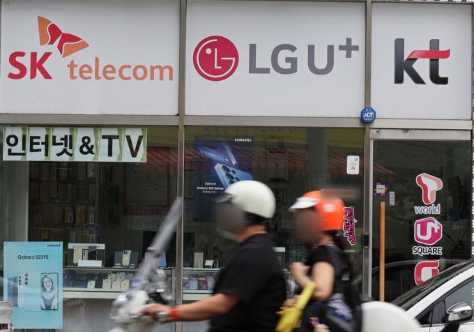 SK텔레콤 사이버 침해 사고 위약금 면제 기한이 하루 앞으로 다가온 13일 서울 서대문구의 한 휴대전화 판매점에 이동통신 3사 로고가 붙어 있다. 이번 사고로 촉발된 이통 3사간의 고객유치전이 막바지로 치달으며 보조금 경쟁 등 과열양상을 띄고 있다./사진=뉴시스 |