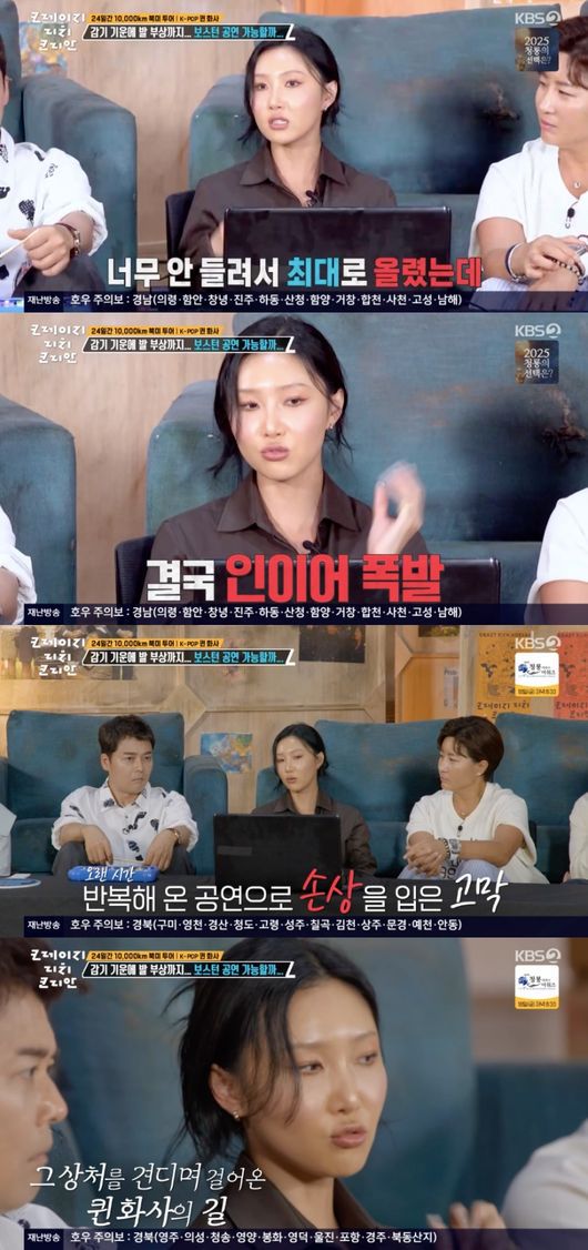 화사는 “시애틀과 LA”라고 답하면서 “함성 소리가 너무 크니까 인이어 볼륨을 최대로 키웠다. 근데도 안 들리더라. 최대로 키우면 이명 생겨서 고막이 다친다. 제가 너무 안 들려서 최대로 올렸는데 인이어가 터졌다”라고 고백했다.