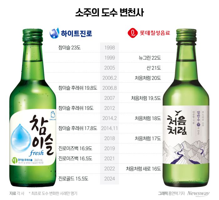 롯데칠성뿐만 아니라 경쟁사인 하이트진로도 이미 저도수 트렌드를 제품에 반영했다. 하이트진로의 대표 소주 제품인 참이슬은 최초 23도였으나, 2006년 2월 처음처럼이 20도로 나오면서 같은해 참이슬도 후레시(19.8도)와 클래식(20.1도)로 제품을 이원화했다. 지난해에는 참이슬 후레시의 도수를 16도로 낮췄고 제로슈거 제품 진로의 도수도 16.5도에서 16도로 낮췄다. 지난해 출시한 진로골드의 도수는 15.5도다.
