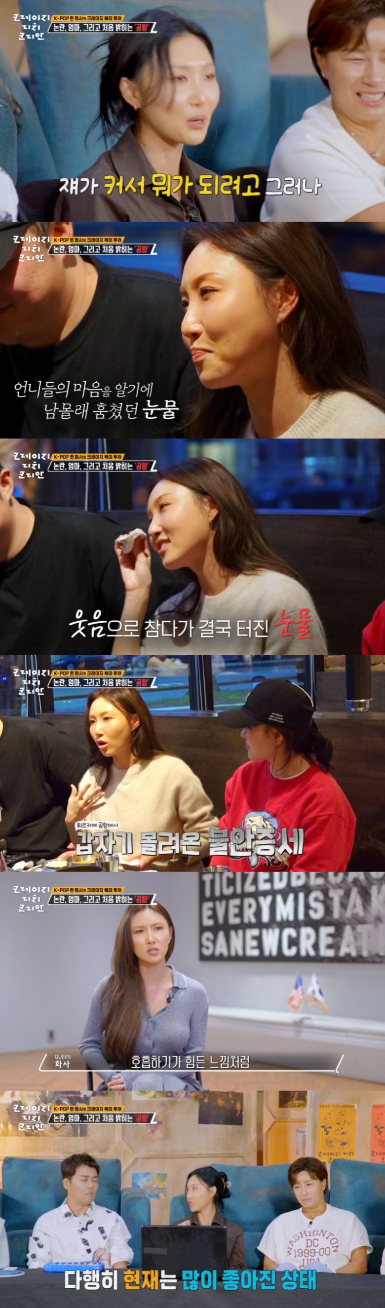 결국 눈물을 흘린 화사는 그때 튀르키예 공항에서 불안정해졌다. 언니들이 동시에 날 안아줬다. 거기서 터졌다"고 공황장애 증상이 있었음을 전했다.