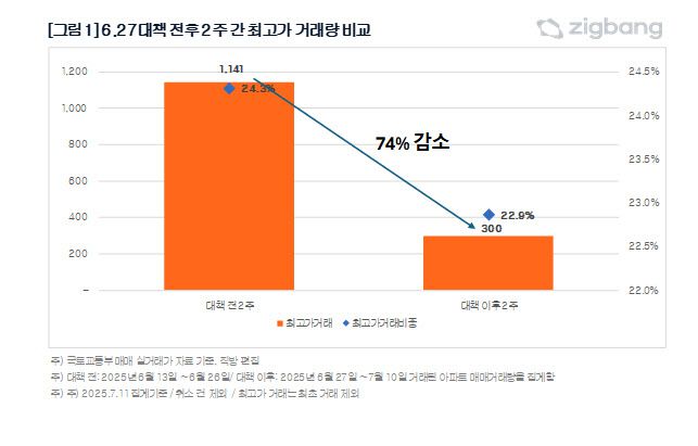 14일 직방이 국토교통부 서울 아파트 매매 실거래가 자료를 분석한 결과 6.27 대출 규제 발표 후 2주간 신고가 거래량은 300건으로 발표 전 2주간 1141건 대비 74% 가량 감소했다.