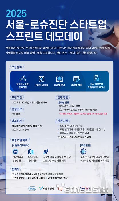 서울바이오허브는 내달 1일까지 글로벌 헬스케어 기업 로슈진단과 함께 '2025 서울-로슈진단 스타트업 스프린트 데모데이' 참여기업을 모집한다고 14일 밝혔다.