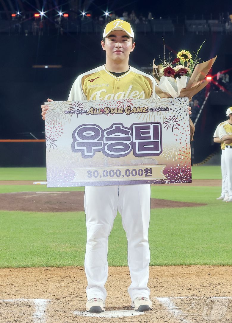 12일 대전 한화생명 볼파크에서 열린 ‘2025 신한 SOL뱅크 KBO 올스타전’에서 8대6 승리를 거둔 나눔 올스타 대표로 한화 문현빈이 기념 촬영을 하고 있다. 2025.7.12/뉴스1 ⓒ News1 김진환 기자 |