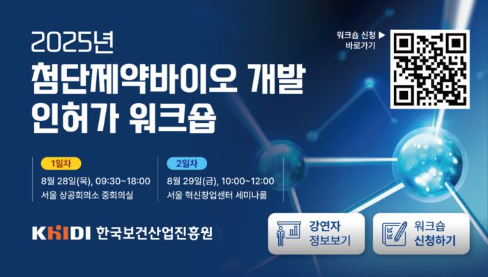 한국보건산업진흥원이 다음 달 28일부터 29일까지 이틀간 서울 중구 대한상공회의소와 보건산업혁신창업센터에서 '2025 첨단제약바이오 개발 인허가 워크숍'을 개최한다고 14일 밝혔다.