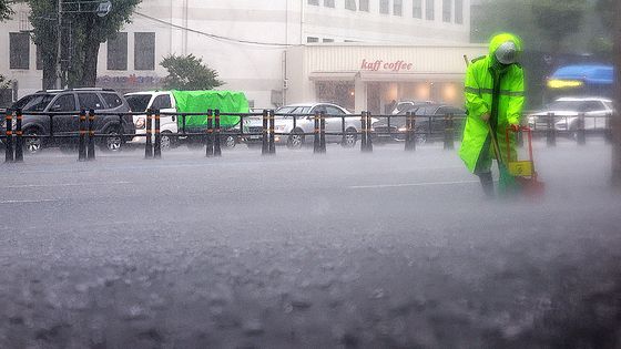 지난달 16일 폭우가 쏟아진 서울 서대문구에서 환경미화원이 인도를 청소하고 있다. 연합뉴스