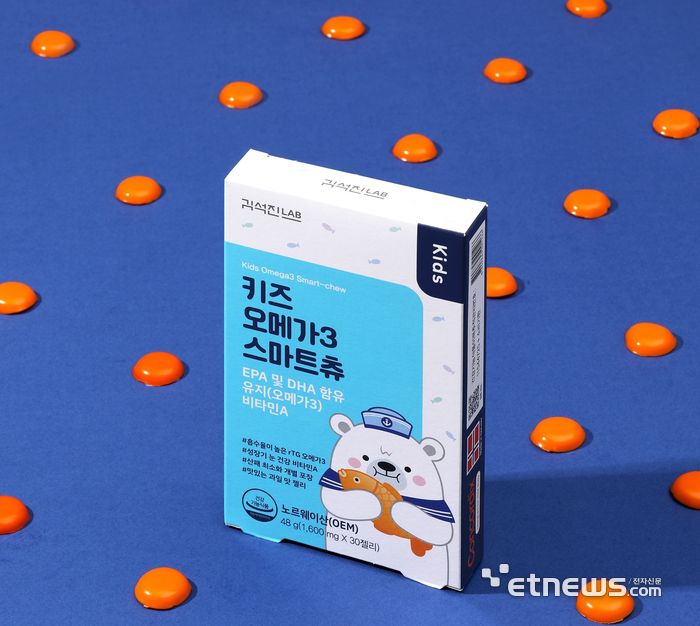 김석진LAB(랩) '키즈 오메가3 스마트츄'는 노르웨이에서 직수입한 제품으로, EPA 및 DHA를 합쳐 502mg을 함유했다. 어린이의 혈중 중성지질 개선과 혈행개선에 도움을 줄 수 있다. 또 비타민A (300 ㎍ RAE)도 함께 담아 눈 건강까지 함께 챙길 수 있다.