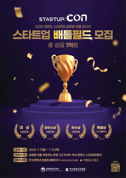 문화체육관광부와 한국콘텐츠진흥원은 오는 9월 개최되는 한국 콘텐츠 업계 유일의 스타트업 행사 '2025 스타트업콘'의 '배틀필드' 참가 기업을 공개 모집한다고 14일 밝혔다.