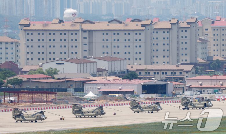 도널드 트럼프 미국 대통령이 8일(현지시간) 한국이 자국의 방위비를 스스로 부담해야 한다고 말했다. 트럼프 대통령의 이번 발언은 8월 1일까지 유예기간을 연장한 상호관세의 본격적인 협상을 앞두고 한국의 방위비 분담금 인상을 요구하며 압박하려는 의도도 있는 것으로 풀이된다. 사진은 9일 오후 경기 평택시 팽성읍 주한미군기지 캠프 험프리스에 헬기가 계류되어 있는 모습. 2025.7.9/뉴스1 ⓒ News1 김영운 기자