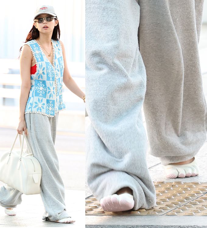 이날 인천국제공항에 등장한 제니는 빨간색 브라톱에 흰색과 하늘색이 어우러진 크로셰 니트 조끼를 걸치고, 회색 스웨트 팬츠에 독특한 '발가락 신발'을 신어 눈길을 끌었다.