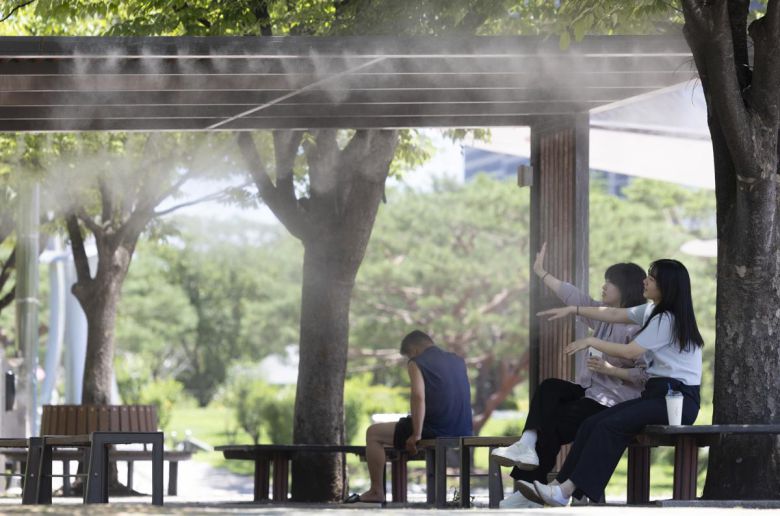 연일 폭염이 계속되는 가운데 11일 서울 영등포구 여의도 공원에서 시민들이 쿨링포그를 맞으며 더위를 피하고 있다. 2025.07.11. [서울=뉴시스]