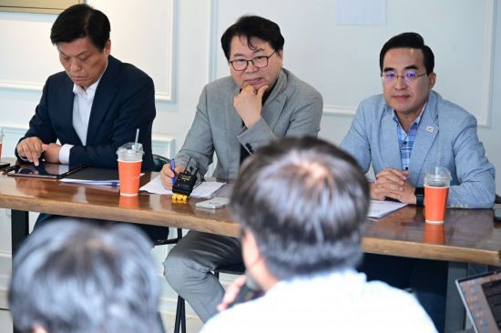 이한주 국정기획위원장이 13일 서울 종로구 한 카페에서 열린 기자간담회에서 취재진의 질문을 듣고 있다. 공동취재기자단 연합뉴스 |