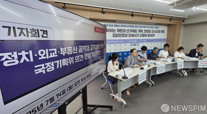 [서울=뉴스핌] 양윤모 기자 = 경실련이 14일 오전 정치·외교·부동산 공약과 조직개편 관련 국정기획위원회 의견 전달 기자회견을 서울 종로구 동승동 경실련 강당에서 개최 했다. 이 자리에는 서희원 정치입법팀장, 하상응 정치개혁위원장(서강대 정치외교학과 교수), 김동원 지방자치위원장(인천대 행정학과 교수), 김송원 인천경실련 사무처장, 김일한 통일협회 위원장(동국대 북한학연구소 교수), 조정흔 토지주택위원장(감정평가사), 신현기 정부개혁위원장(가톨릭대 행정학과 교수)가 참석 했다. 2025.07.14 yym58@newspim.com