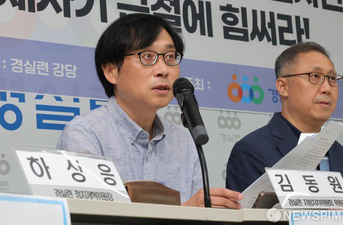 [서울=뉴스핌] 양윤모 기자 = 김동원 경실련 지방자치위원장이 14일 오전 서울 종로구 동승동 경실련 강당에서 정치관련 국정기획위원회 의견 전달 기자회견에서 발언을 하고 있다.  이 자리에는 서희원 정치입법팀장,하상응 경실련 정치개혁위원장(서강대 정치외교학과 교수),김동원 지방자치위원장(인천대 행정학과 교수), 김송원 인천경실련 사무처장,김일한 통일협회 위원장(동국대 북한학연구소 교수),조정흔 토지주택위원장(감정평가사),신현기 정부개혁위원장(가톨릭대 행정학과 교수)가 참석 했다. 2025.07.14 yym58@newspim.com