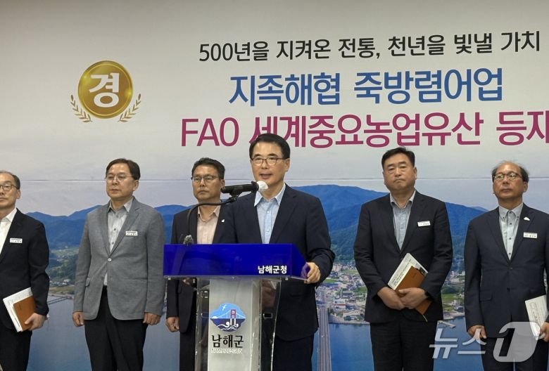14일 장충남 남해군수가 군청 대회의실에서 세계중요농업유산으로 등재된 지족죽방렴 어업의 보존과 전승을 위한 향후 사업 계획을 밝히고 있다.2025.07.14/뉴스1 강미영기자 |
