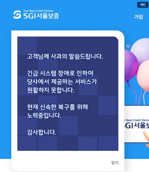 14일 금융권에 따르면 이날 오전 SGI서울보증 홈페이지에 '긴급 시스템 장애로 인해 일부 서비스 제공에 이상이 발생했다"며 "외부 전문기관과 협력해 신속한 복구를 위해 노력 중'이라는 공지문이 떴다. 이로 인해 보증보험 관련 서비스 대부분을 이용할 수 없는 상태다.